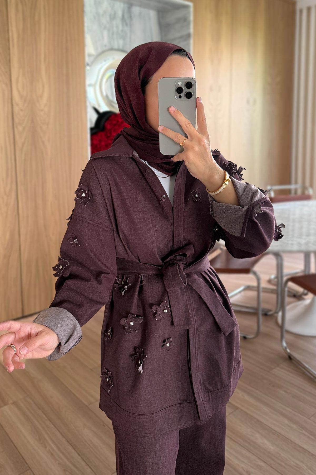 3 Boyutlu Çiçek Detay Kot Takım - Bordo (KH-2114)