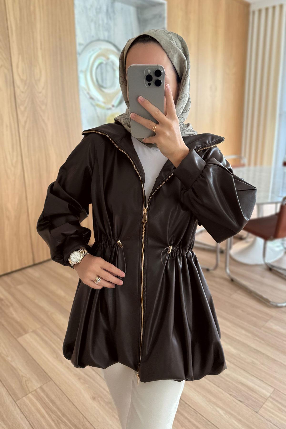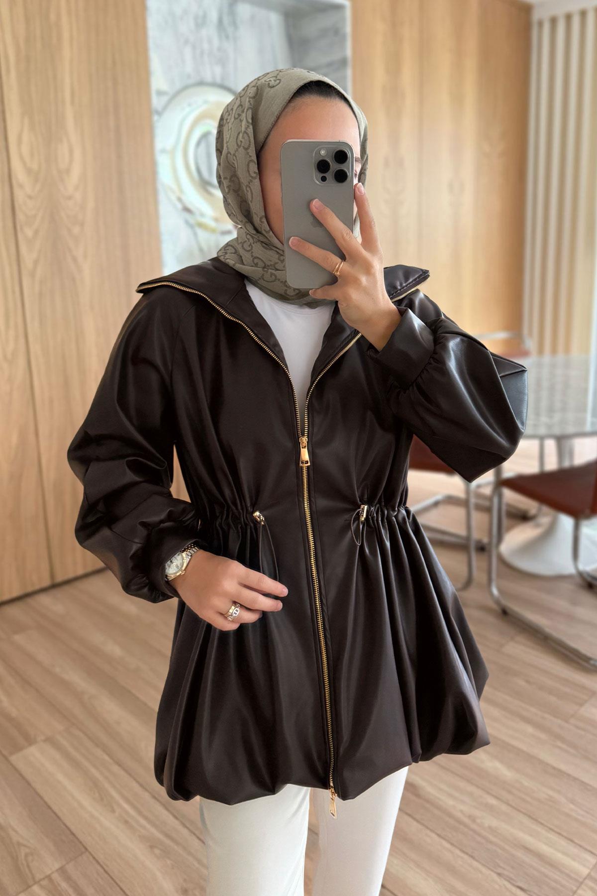 Beli Büzgülü Deri Ceket - Kahverengi (KH-2135)