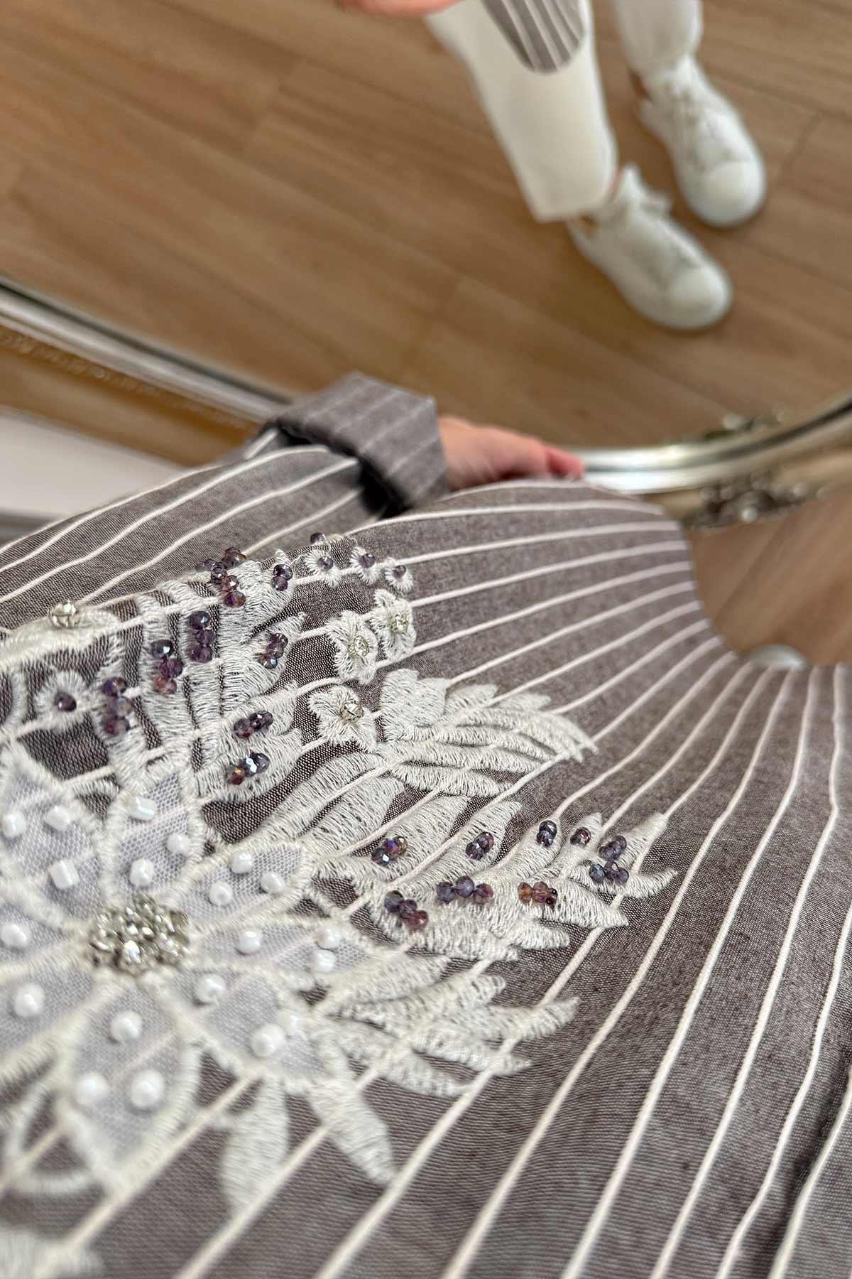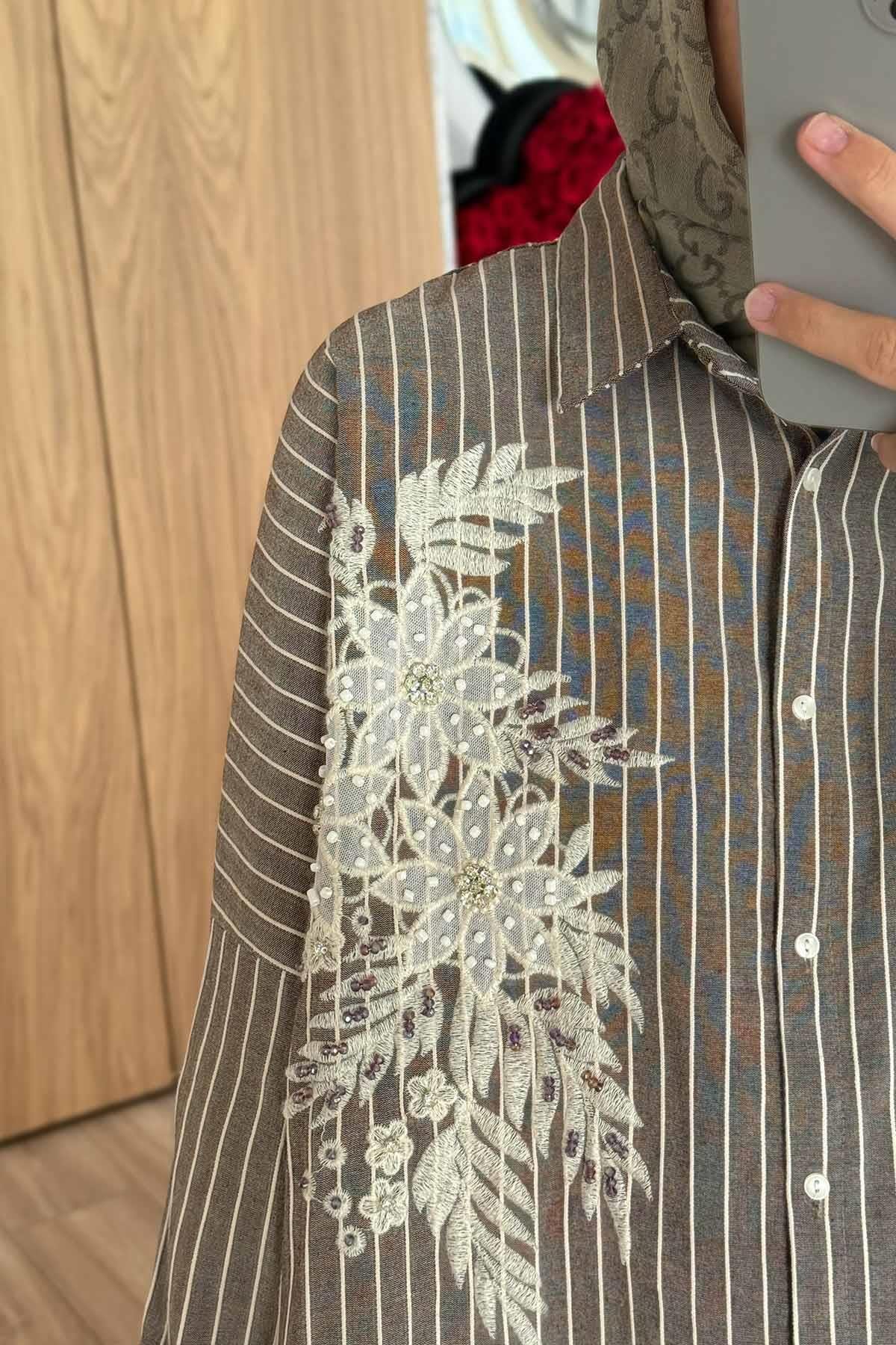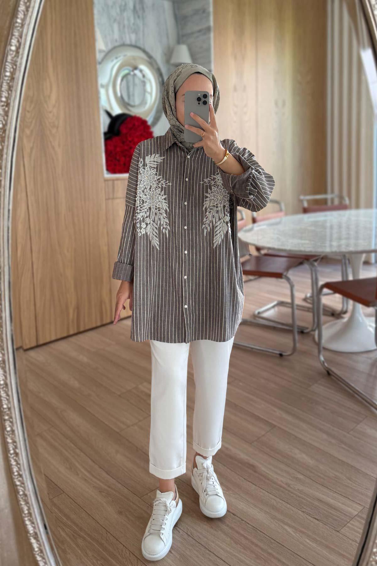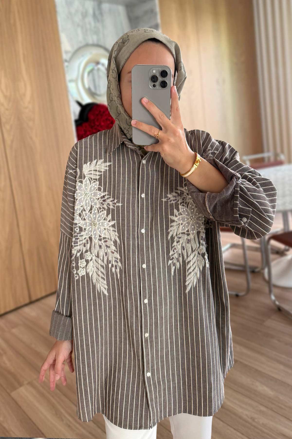 Nakış Detay Çizgili Gömlek - Kahverengi (KH-2117)
