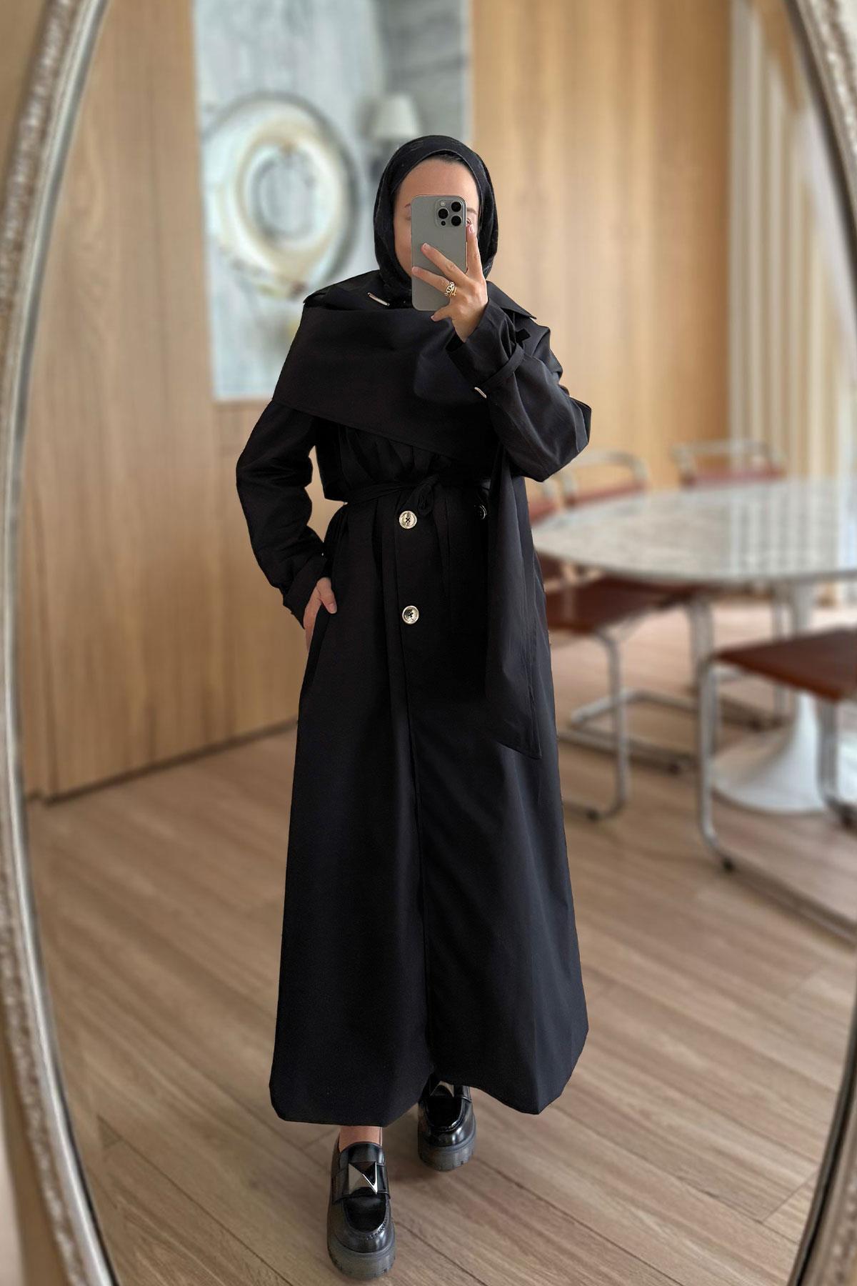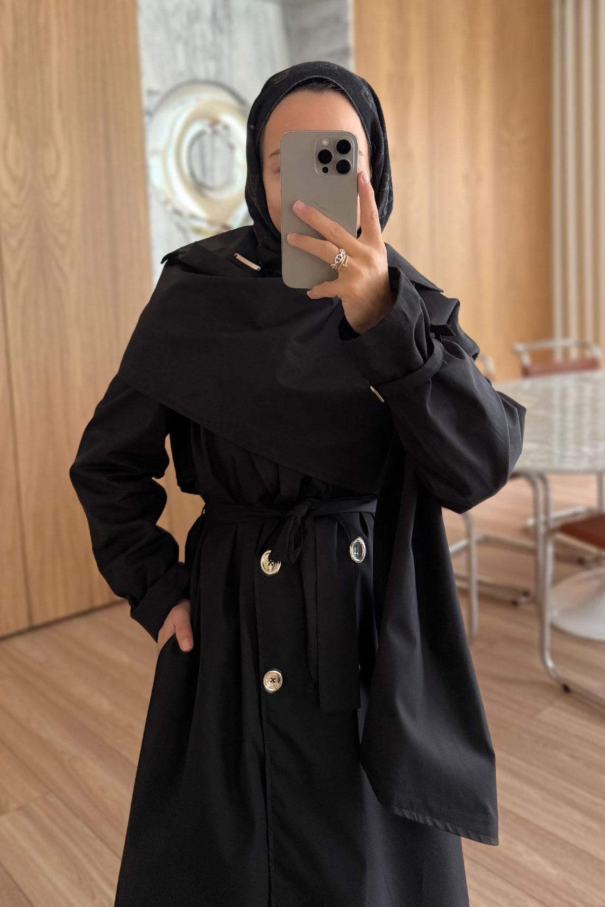 Şal Detay Maxi Boy Trençkot - Siyah (KH-2122)