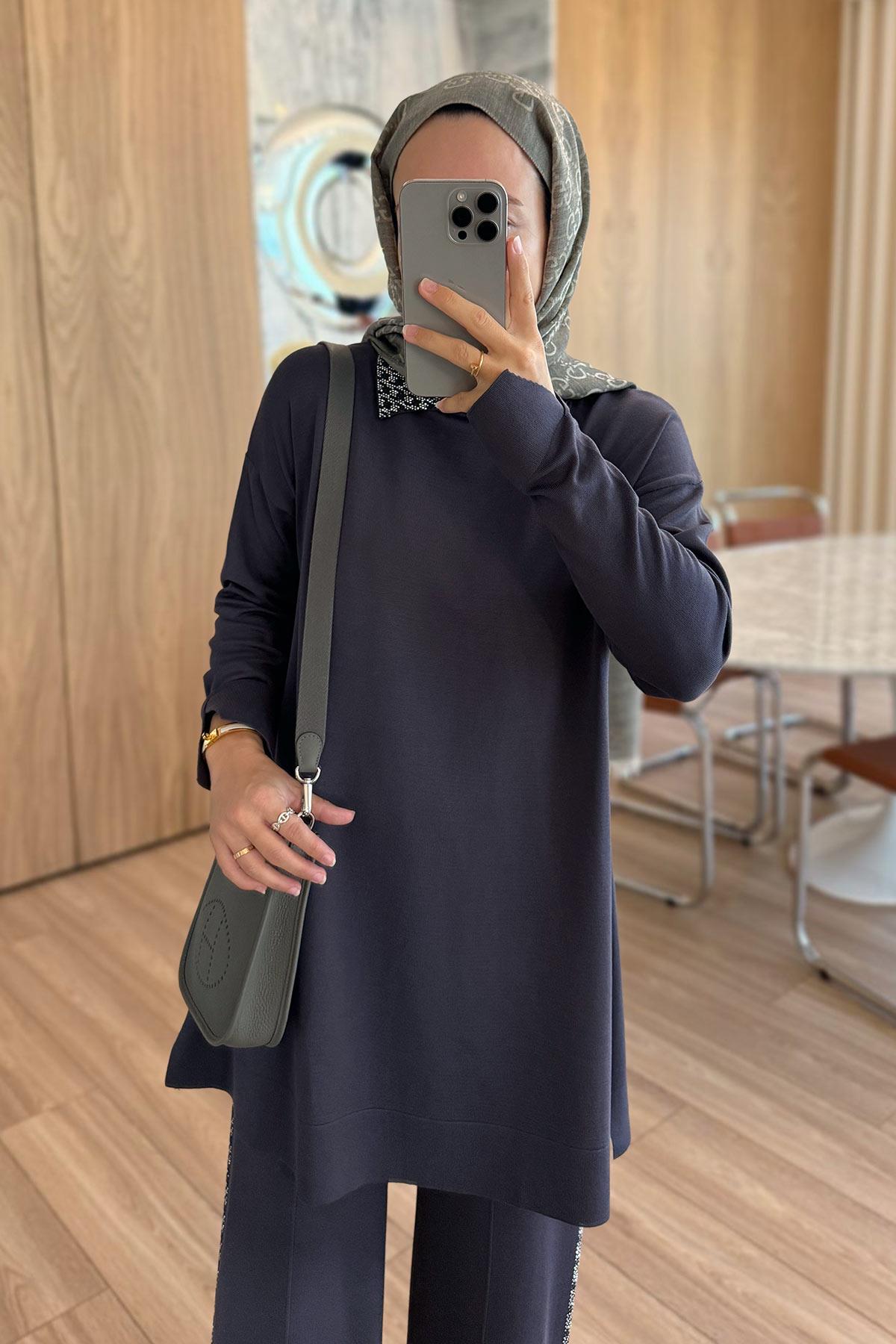 Şıklık ve konforu bir araya getiren Taş Detaylı Merserize Tunik–Pantolon Takım (Füme). Nefes alan merserize dokusu sayesinde hafif ve serindir; dökümlü kesim rahat bir silüet sunar.