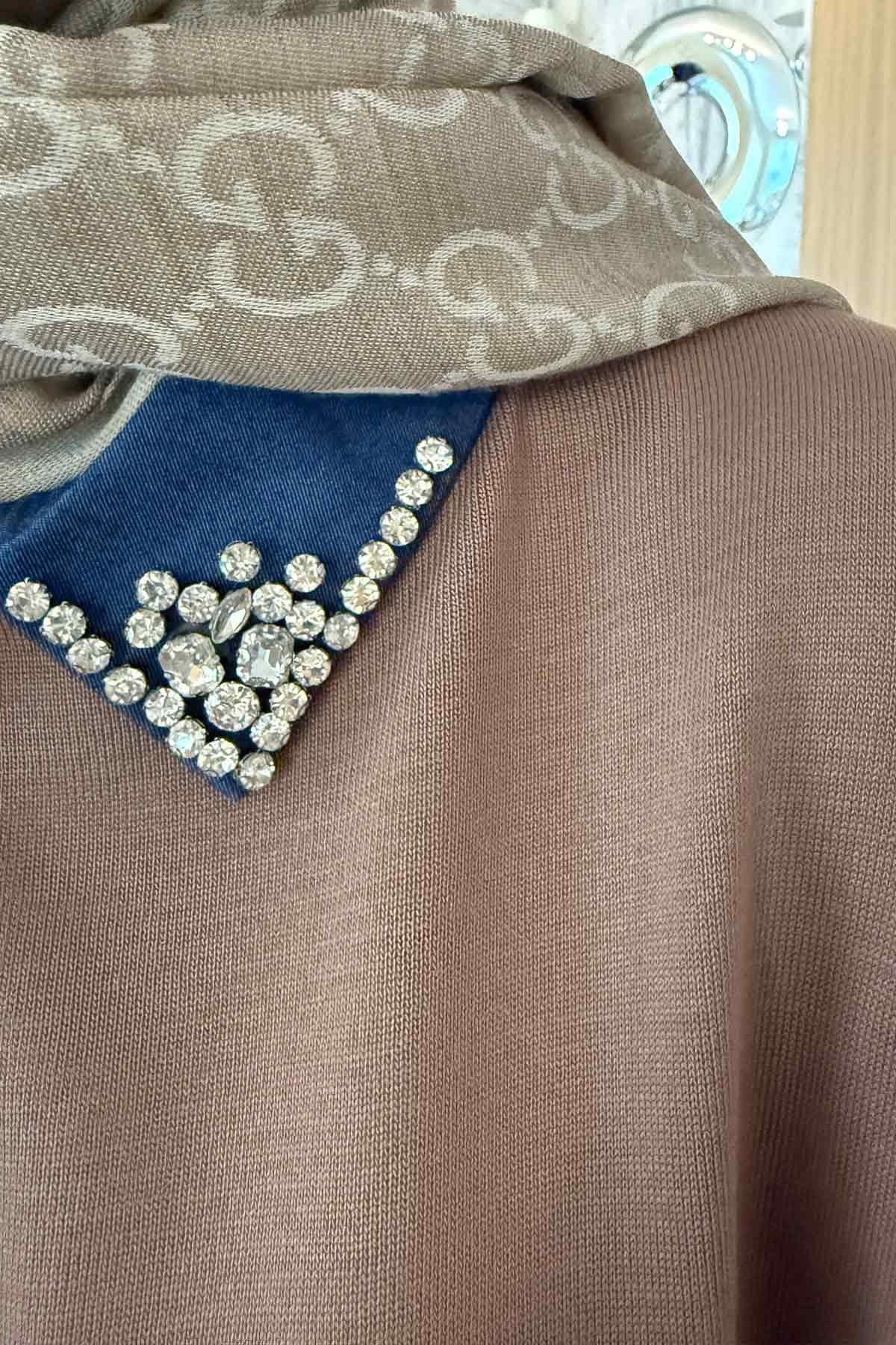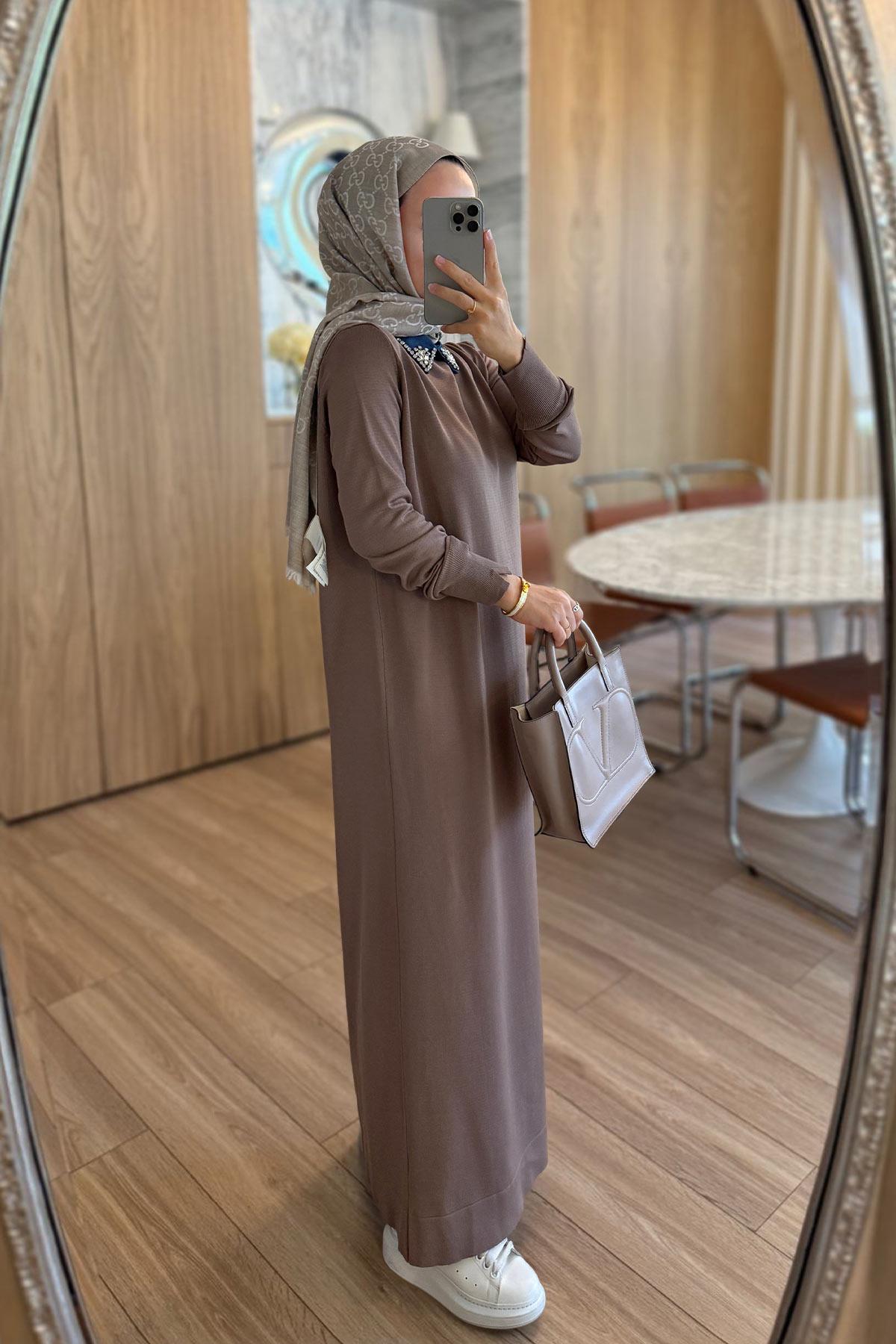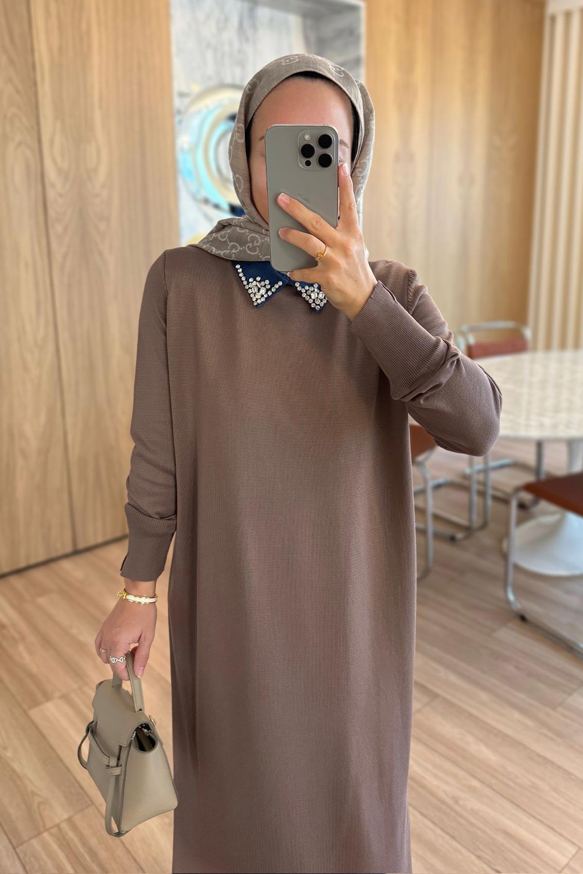 Zarafeti ve şıklığı bir araya getiren Yakası Taşlı Uzun Merserize Elbise - Vizon, modern tesettür stilini yansıtan özel bir parçadır.
