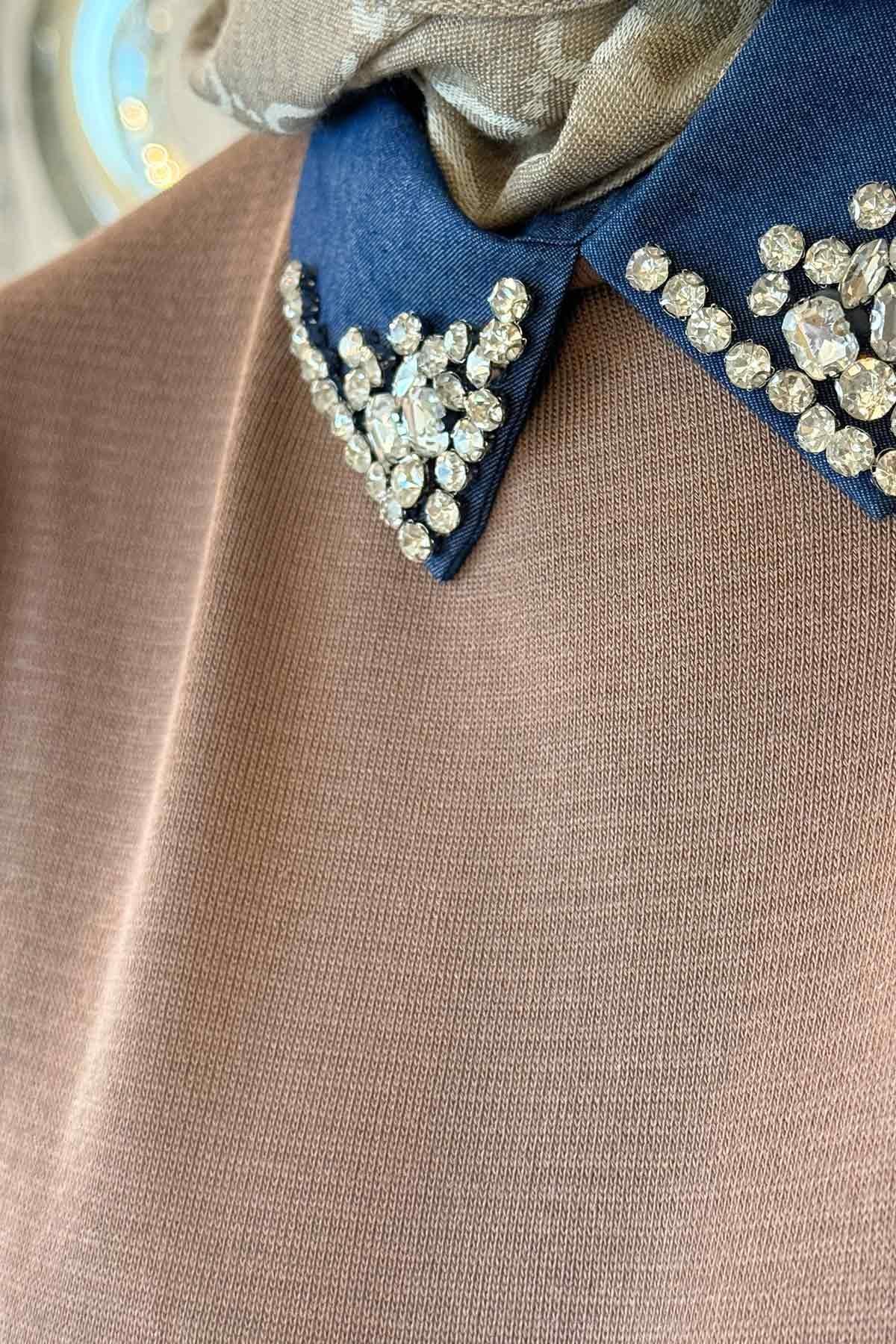 Göz alıcı taş detaylı yakası ile sade şıklığını öne çıkaran bu elbise, hem günlük kullanım hem de özel davetler için ideal bir tercihtir.