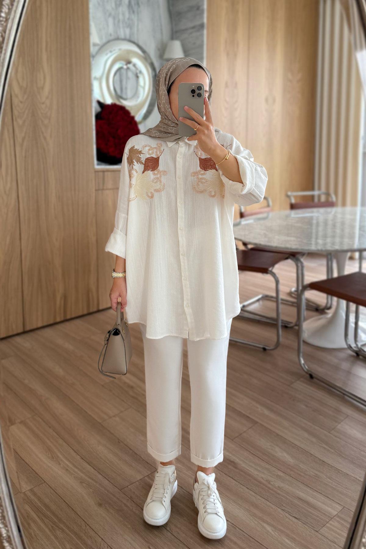 Yaprak Desen Nakışlı Gömlek - Beyaz (KH-2119)