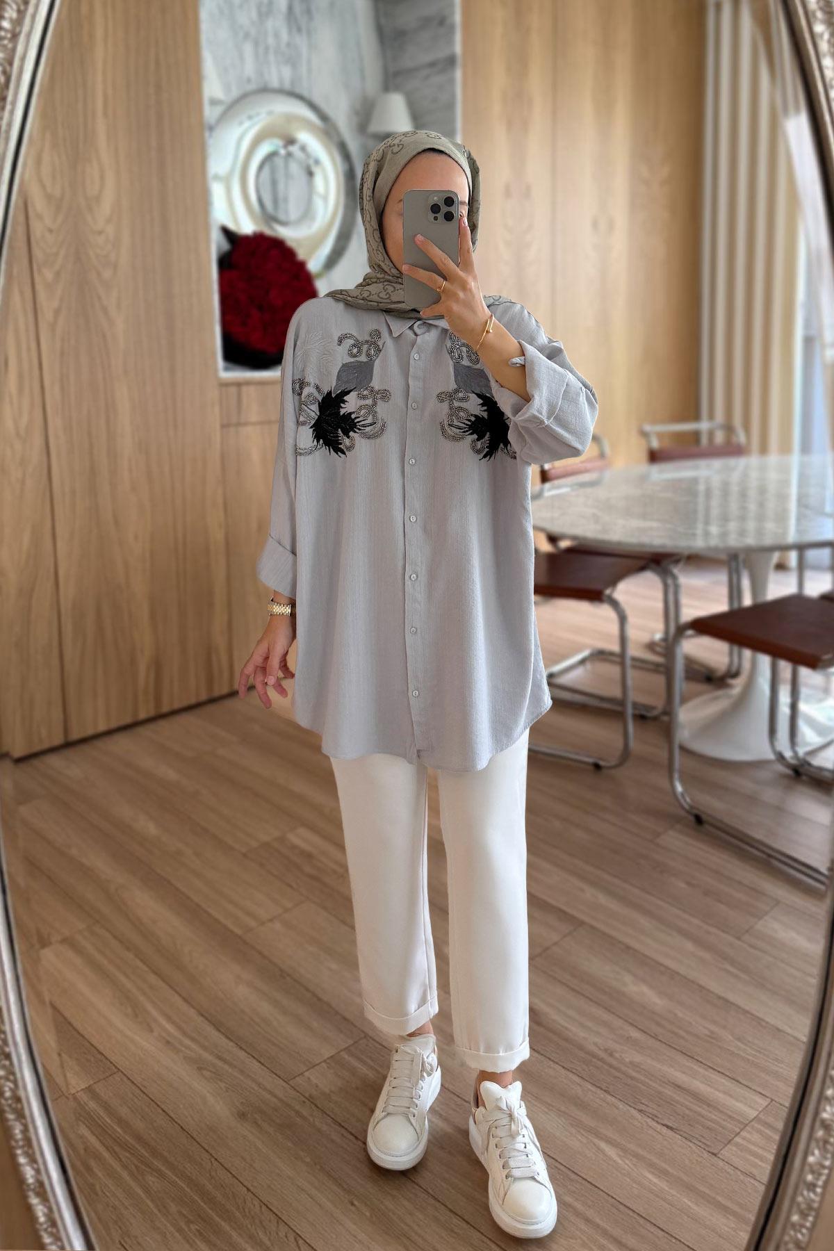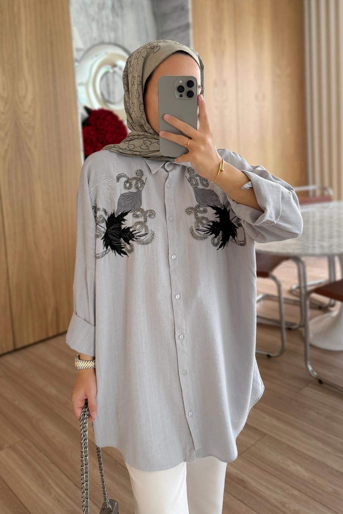 Yaprak Desen Nakışlı Gömlek - Gri (KH-2119)