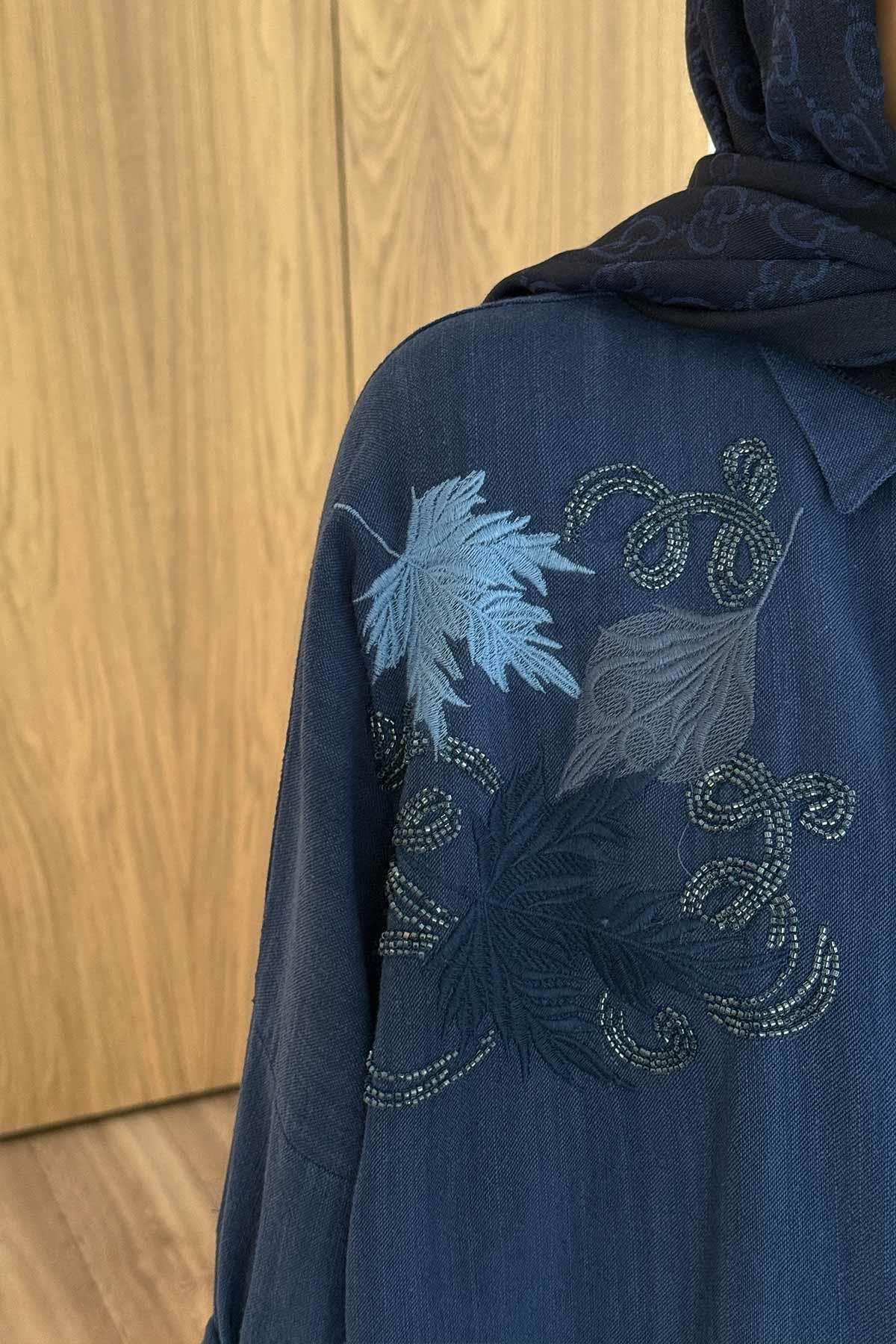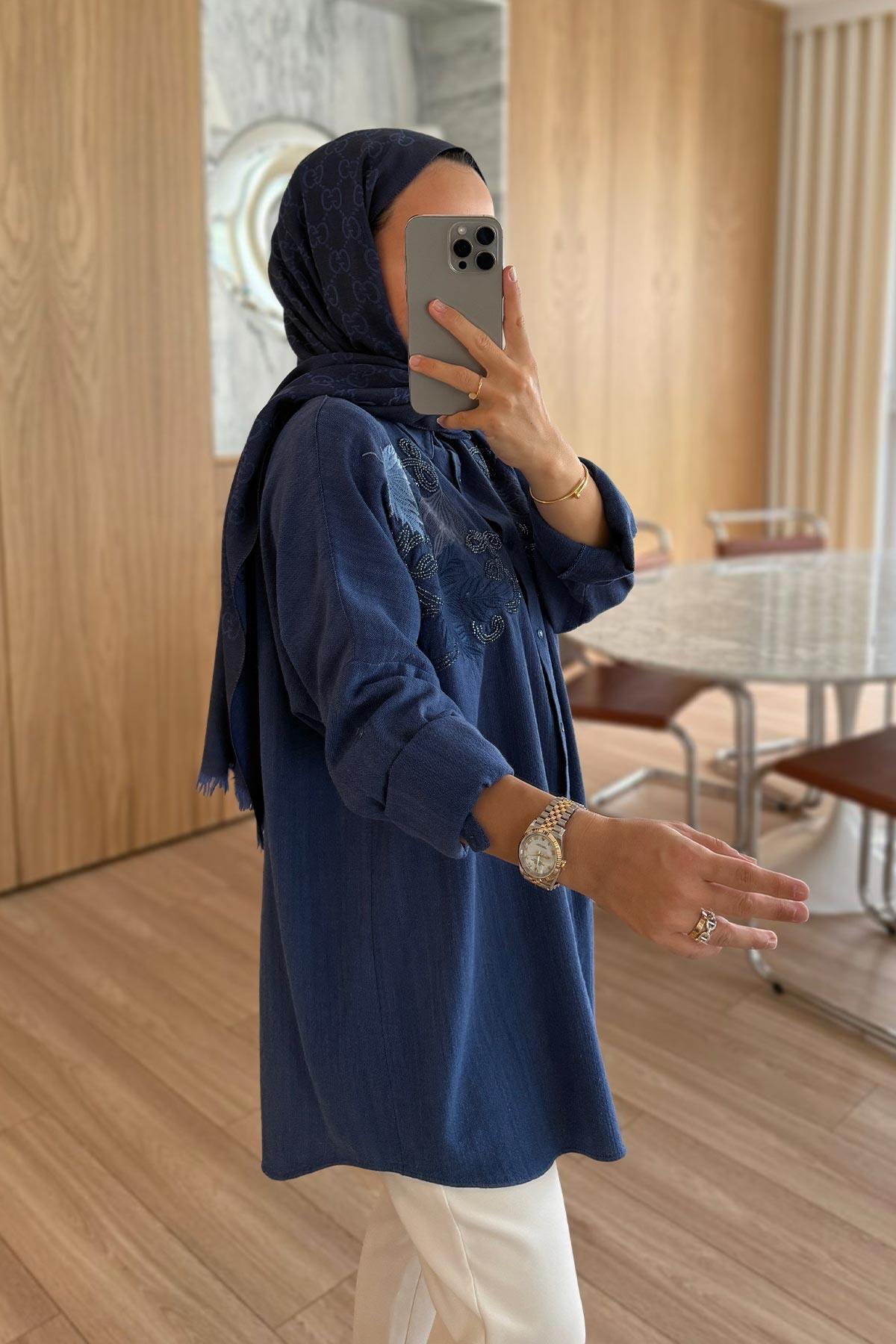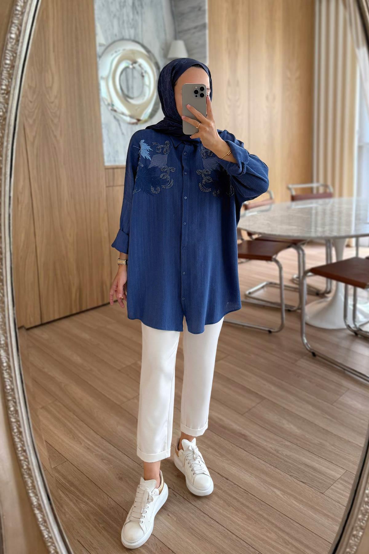 Yaprak Desen Nakışlı Gömlek - İndigo (KH-2119)
